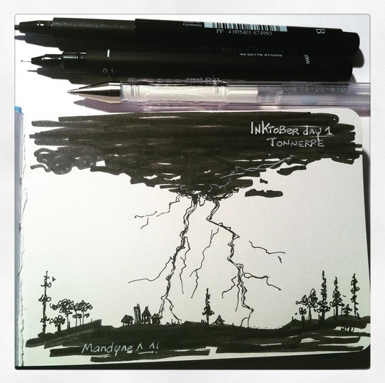 J’ai donc gribouYé le tonnerre pour le 1er jour (bon en fait j’ai un peu triché, j’ai dessiné un éclair, mais j’vous jure que dans ma tète le tonnerre grondait !!!)